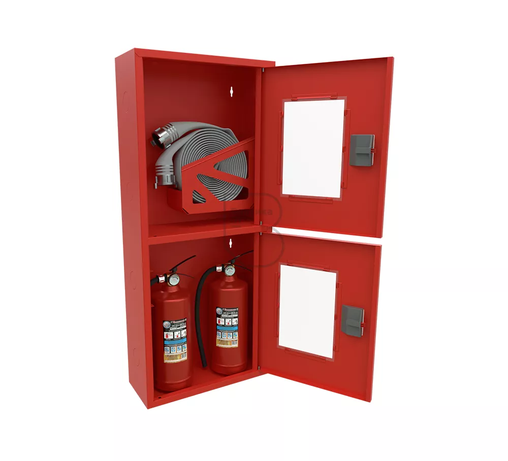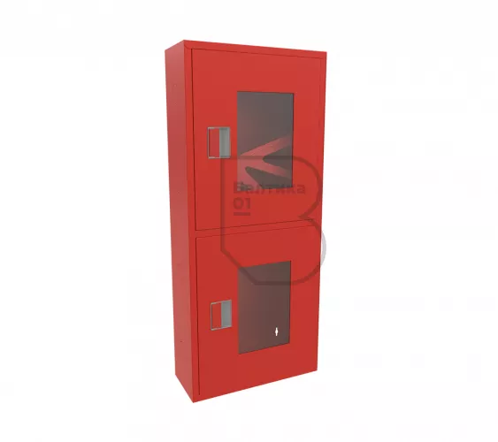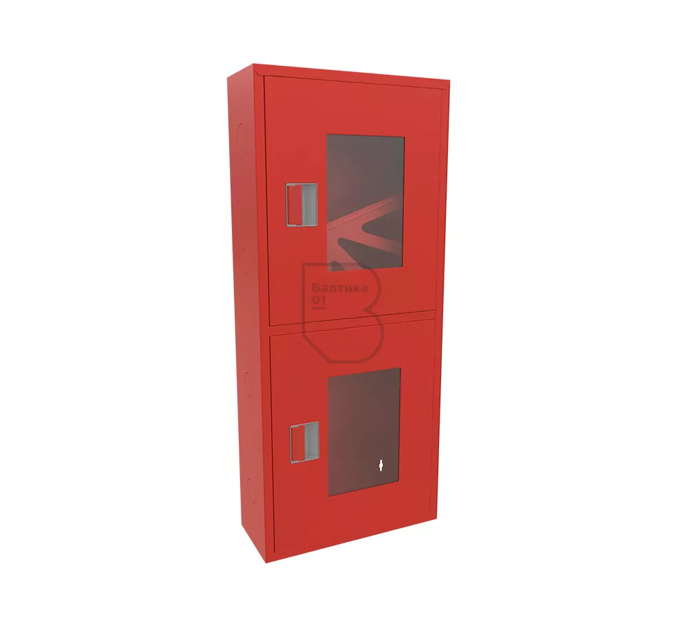 Дверца пожарного шкафа открывается на 160 градусов, открывание двери универсальное (правое и левое). Дверца имеет дополнительные загибы для усиления жесткости конструкции. На двери и корпусе шкафа предусмотрены отверстия для опломбирования шкафа. Дверь пожарного шкафа имеет запорное устройство в виде пластиковой защелки. Дверь закреплена с помощью монтажного штифта, при необходимости она может быть снята в результате простого нажатия на кнопку штифта. На каждой дверце имеется смотровое окно со вставкой из стекла.