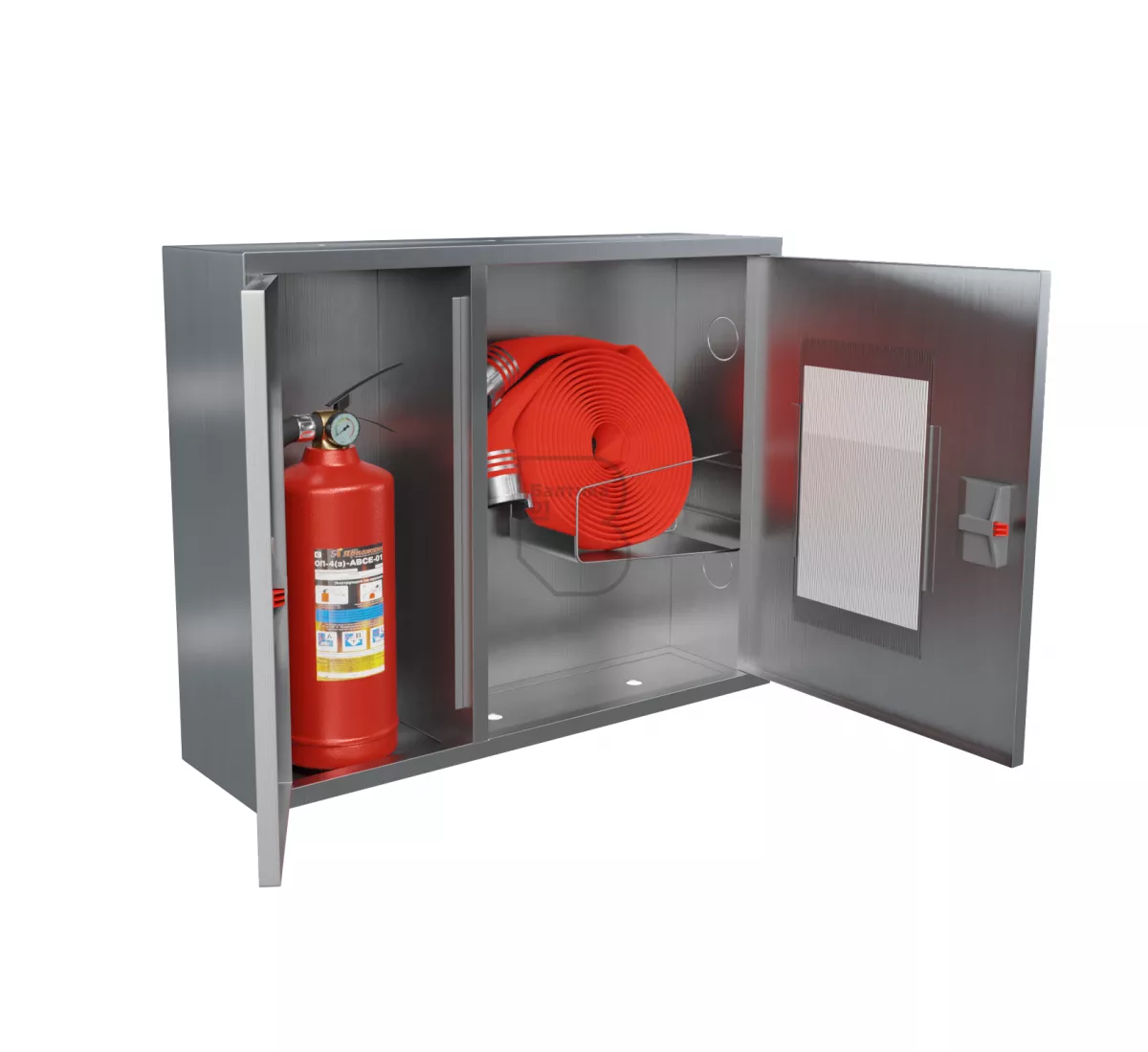 Дверцы пожарного шкафа открываются на 160 градусов. Имеют запорное устройство в виде пластиковой защелки.